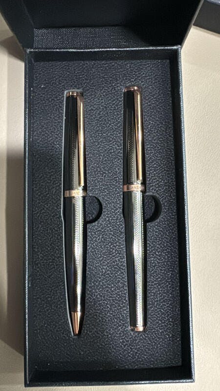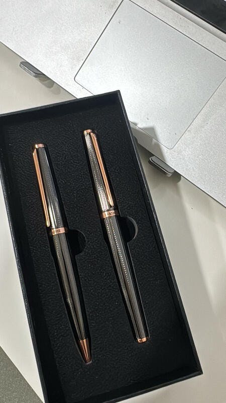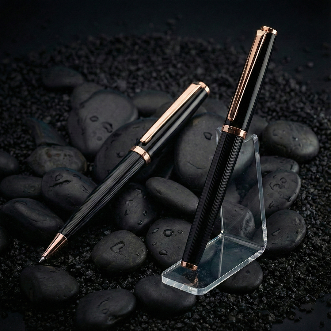A refined metallic ball pen and roller pen duo, crafted in sleek black with rose-gold accents for effortless elegance and smooth, premium writing.